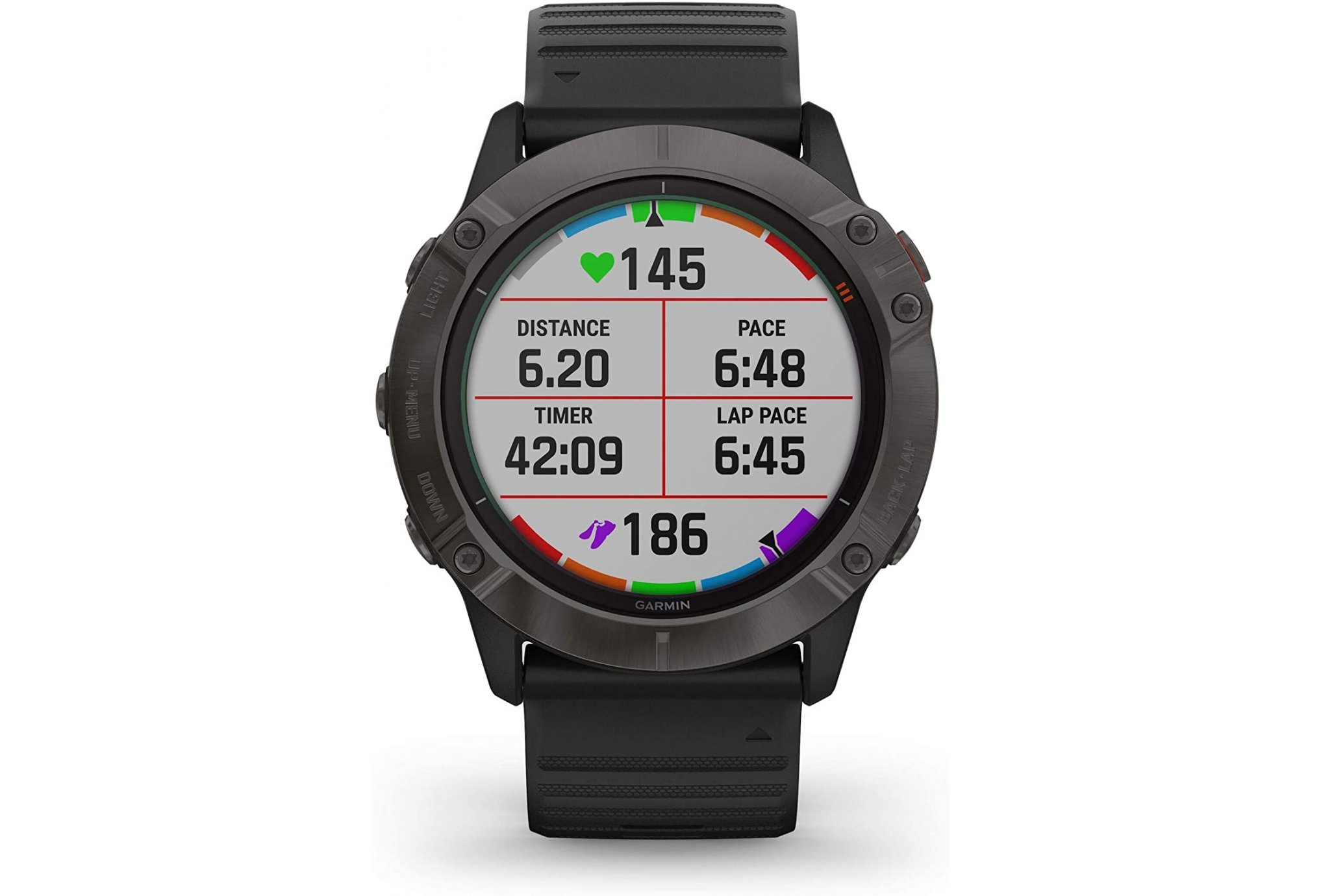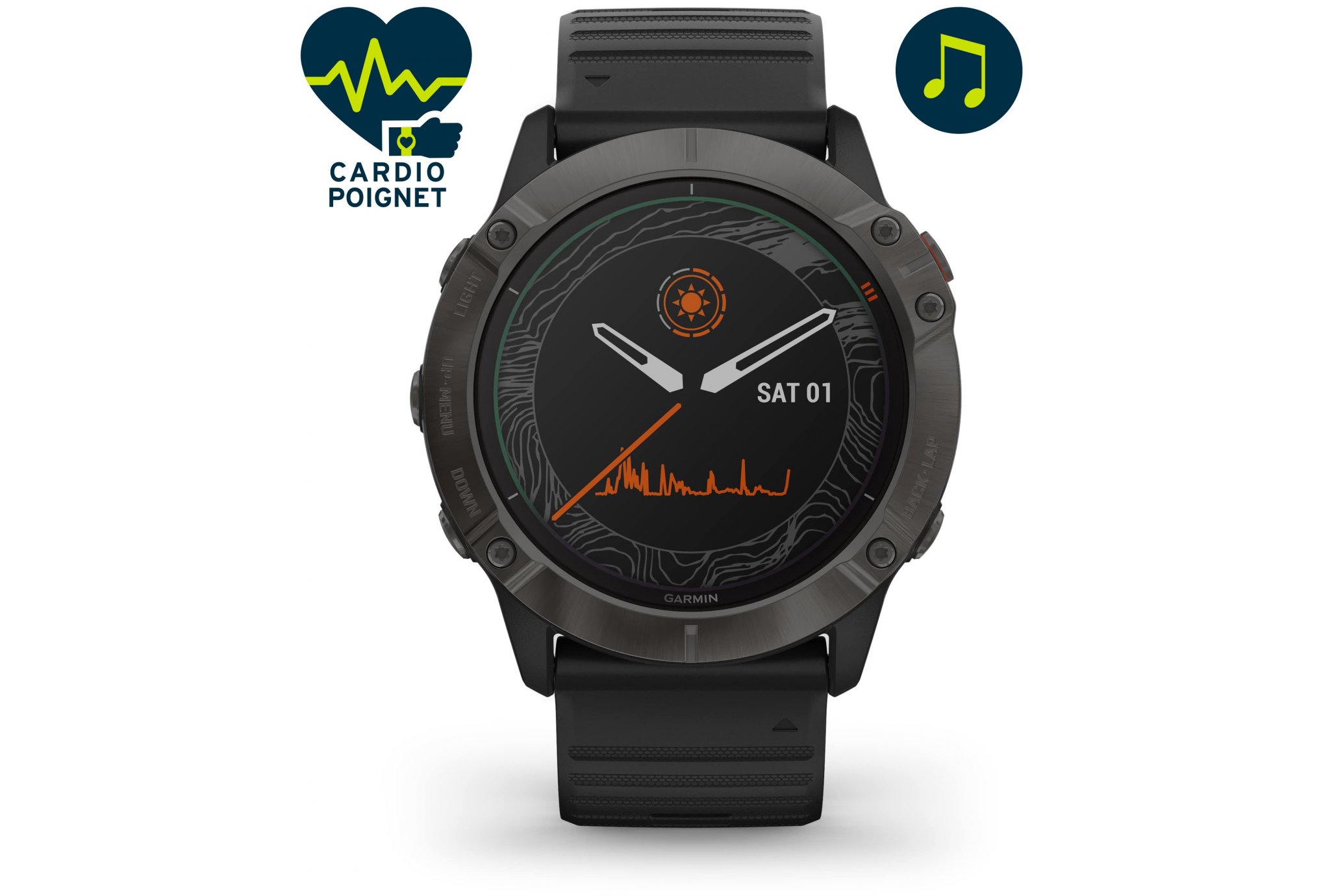 - Autonomie : mode smartwatch 21 jours (+ 24 heures/semaine*), GPS/Cardio 60 h (+6 h**), GPS/Cardio/Music 15 h (+1h **), GPS avec économie de batterie 120 h (+28 h**)