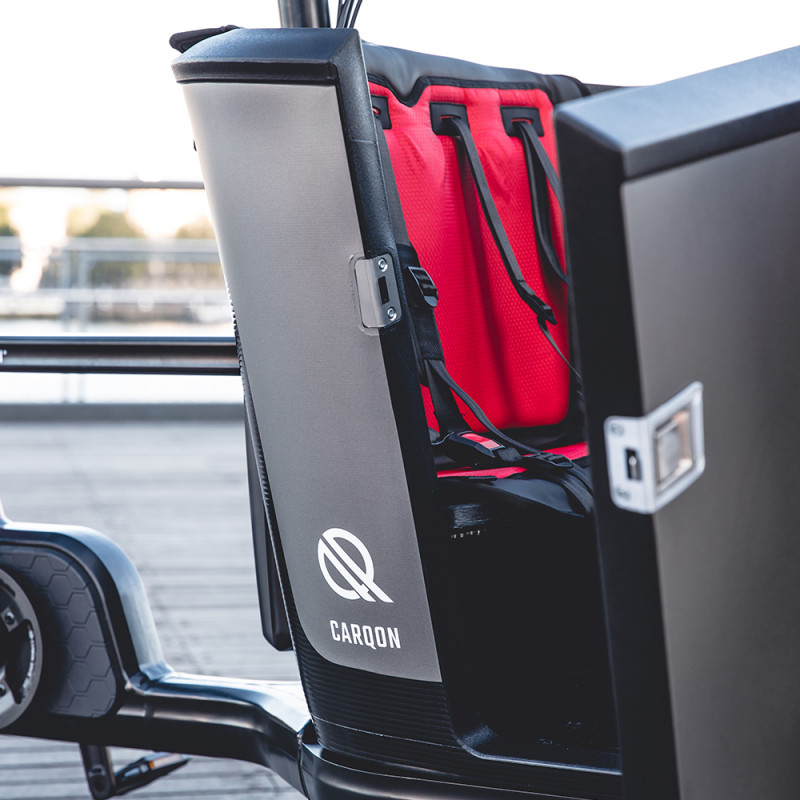 Le vélo cargo Carqon Classic est particulièrement confortable à utiliser grâce à la grande rigidité en torsion du cadre en aluminium, au centre de gravité bas, aux larges pneus tout-terrain et à la suspension de la fourche avant. Même sur les routes les plus accidentées, votre enfant continuera de dormir… comme un bébé.